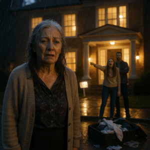 On a stormy evening, under the glow of a mansion’s fresh paint and bright floodlights, a mother stood drenched in rain. Mascara streaked down her cheeks. In her hand was a suitcase she had carefully packed that morning with fragile hope.