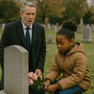 A grieving billionaire knelt in shock when he found a little Black girl standing quietly at his daughter’s grave with flowers in her hand—and the heartbreaking truth she revealed next moved everyone in the cemetery to tears.