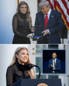 The room was hushed. Rows of veterans, lawmakers, and faith leaders stood shoulder to shoulder, yet the silence carried more power than any words could. At the center of it all stood Erika Kirk, Charlie’s widow, dressed in understated grace. When the President placed the medal in her trembling hands, she bowed her head — not in defeat, but in reverence. Her eyes glistened as though reflecting both the pain of loss and the light of legacy.