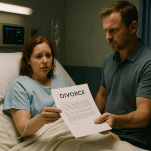 Her body froze. Disbelief washed over her. This was the man she had trusted, the man who vowed “in sickness and in health.” And here he was—choosing her weakest moment to tear their marriage apart.