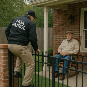 After Months of HOA Patrols Sneaking Into Our Yard to “Inspect” Violations, Grandpa Finally Had Enough—So He Quietly Rigged the Front Gate with a Low-Voltage Electric Deterrent and Waited on the Porch With His Lemonade. What Happened When the HOA Officer Tried Climbing the Fence Again Shocked the Entire Neighborhood.