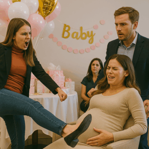 “An Arrogant Guest Insulted and Kicked the Expectant Mother at Her Own Baby Shower, Laughing Until the Door Opened — When Everyone Saw Who the Woman’s Husband Really Was and What He Did Next, Every Smile in the Room Vanished and the Night That Was Meant to Humiliate Her Turned Into a Lesson No One Would Ever Forget”