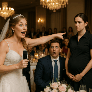 All eyes followed the bride’s gaze toward the far corner of the hall. There, standing stiffly against the wall, was a young woman in a plain black uniform. She might have gone unnoticed had it not been for the bride’s deliberate attention. Her trembling hands clutched the hem of her apron, and though she kept her eyes down, the undeniable curve of her stomach betrayed what she carried.