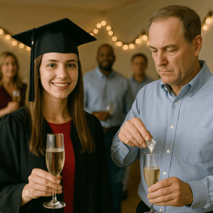 At My Graduation Party, I Saw My Father Slip Strange Powder Into My Champagne—So I Stood, Smiling, Until a Hidden Family Secret, a Long-Buried Promise, and the Real Reason Behind His Gesture Finally Revealed Themselves