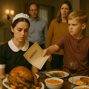 At Thanksgiving Dinner, My Sister’s 8-Year-Old Threw the Menu at Me and Yelled, “Mom Says Maids Eat in the Kitchen!” Everyone Laughed — Until My Sister Saw What I Put on the Table an Hour Later. What Happened Next Made Them All Go Silent Forever.