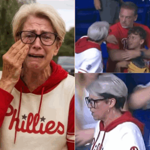 But the joy soon turned to conflict. A nearby Phillies supporter leaned forward, urging the father and son to hand over the ball. What could have been a forgettable dispute between fans escalated when cameras caught the exchange. The boy’s excitement dimmed, the father looked trapped, and the woman’s gestures became the defining image of the night.