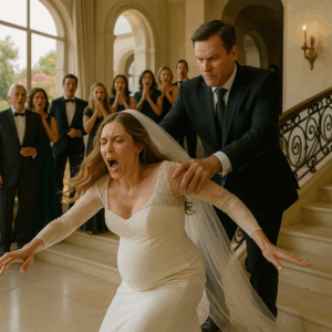 Gasps ripped through the hall. Glasses shattered on the floor. Veronica tumbled, veil unraveling, bouquet scattering petals like blood drops. She landed hard at the foot of the stairs, her white gown stained scarlet.