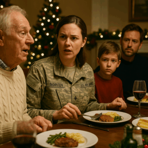 Evelyn sat quietly beside him, hands folded, her smile soft but trembling. She never contradicted him, never defended me. She lived in the space between loyalty and fear. The others at the table followed his lead because it was easier. I had learned to sit quietly, too, because to speak was to invite more mockery. Yet, every time he dismissed my life in uniform, a colder certainty grew inside me. I knew the moment before it came. I could feel it in the stillness of Evelyn’s hands and the shallow breath I drew to steady myself. It was the same performance he always gave, but I also knew, for the first time, that I would not let him finish it on his terms.