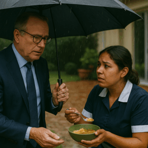 “A Wealthy Businessman Saw His Maid Sitting Alone in the Rain, Eating Scraps From the Trash — What He Did the Next Day Shocked His Family, His Employees, and the Whole Neighborhood Who Thought They Knew the Kind of Man He Was.”
