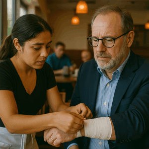 She grabbed the first-aid kit from behind the counter, fashioned a splint from cardboard, and wrapped his arm gently.
