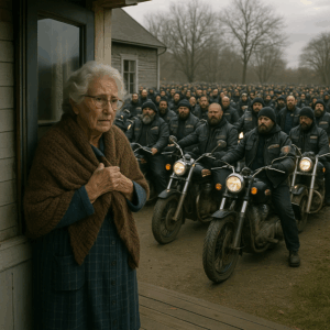 Twenty men stood at her gate. Leather jackets stiff with ice. Faces pale and raw from the cold. Their motorcycles sputtered against the wind.