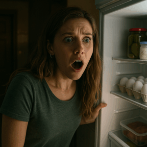Her heart pounded so hard she thought it would burst. She slammed the fridge shut, but the sound — too loud — betrayed her.