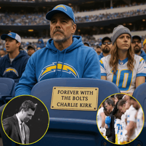 At SoFi Stadium, where thunderous cheers echo every Sunday, one seat will remain empty forever. The Chargers honored late superfan Charlie Kirk with a golden plaque, “Forever with the Bolts.” The moment fans saw it, chills spread through the stands — proof that football’s truest legacy is family and memory.