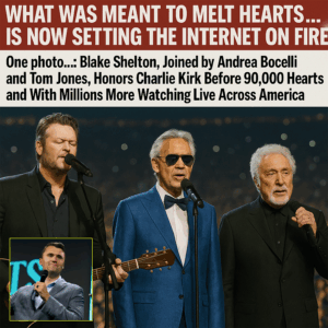 “From Heartfelt Tribute to Global Shockwave: Blake Shelton, Andrea Bocelli, and Tom Jones Unite in a Historic Performance Honoring Charlie Kirk—90,000 Witness It Live, Millions More Join Across America, and One Photograph Sparks a Frenzy That Leaves Fans Asking: Did the World Just Watch the Birth of a Legend?”