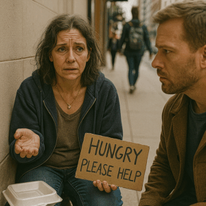 She sat on the sidewalk near the old bakery — wrapped in a thin coat, a cardboard sign resting beside her.