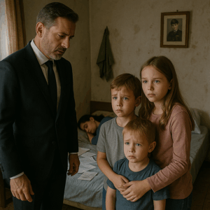Three small children stood there — pale, thin, their eyes wide with fear. The youngest, barely five, clutched his leg with trembling hands and whispered: