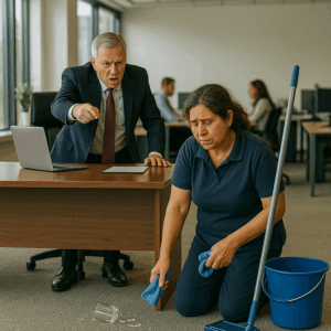 That morning, Rosa moved quietly through the office, mop in hand. She bent to pick up trash, adjusted chairs, and polished desks without complaint. Her hands were cracked from chemicals, her back aching from years of labor, but her spirit carried quiet pride.