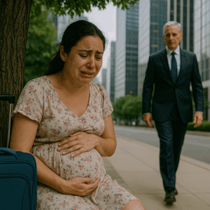 The city sparkled that night, its skyscrapers glittering like stars, its streets buzzing with taxis, flashing billboards, and the endless hum of wealth. Yet, just beneath the shadows of towering buildings, sat Luciana Mendoza — a young woman eight months pregnant, clutching her swollen belly beneath the thin fabric of a wrinkled floral dress.