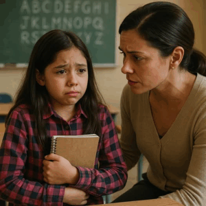 Eight-year-old Emily Walker remained frozen at her desk, clutching her notebook so tightly her knuckles turned white. Her teacher, Miss Carter, noticed the silence and the fear in Emily’s eyes.