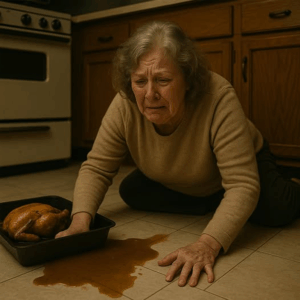 After dinner, I carried the heavy pot back to the kitchen. My foot slipped on the rug. I went down hard. The chicken pot tipped, gravy spilling like a dark river across the floor. My hip screamed, and I couldn’t stand.