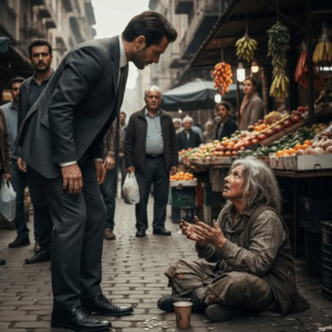 Instead of walking past, Daniel lashed out. His polished shoe struck the woman’s thin leg, knocking her cup across the pavement. Coins scattered. Gasps rippled through the market.