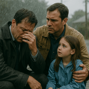 Behind her stood a man — tall, worn, his coat soaked but his eyes kind.