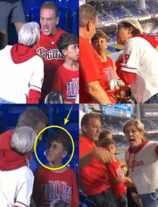 Baseball games are supposed to be family memories — a chance for fathers and sons to bond over hot dogs, cheers, and fly balls. But for Drew Feltwell and his son Lincoln, one innocent toss of a ball turned into a viral spectacle when a smug bystander — quickly branded “Phillies Karen” by the internet — decided to humiliate them on live television.