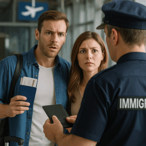 But at passport control, the mood shifted. The officer scanned their documents, then frowned. He tapped on his screen, called over a colleague, and leaned forward.