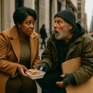 “She Thought It Was Just an Ordinary Act of Kindness When She Gave a Beggar Her Coat and Lunch—But What the Old Man Did Next Not Only Shocked Her, It Stunned the Entire City Into Awe and Fear”