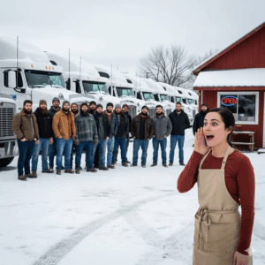 A week later, a package arrived. Inside were twelve thank-you notes—one from each trucker—along with a photo of them standing in front of my diner, snow piled high behind them.
