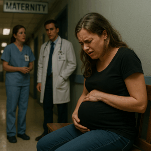 On a rickety wooden bench against the wall sat a young woman, her posture curled in visible discomfort. Her breathing was shallow, uneven, punctuated by soft groans that hinted at pain she could no longer conceal. The hallway, usually filled with passing nurses and anxious relatives, grew strangely quiet as eyes turned toward her. She looked out of place—like a figure torn out of a story no one understood.