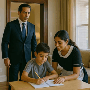 He followed the sound down the corridor, his shoes barely making a sound on the marble floor. As he reached the study door, he heard a woman’s voice—soft, patient, and filled with warmth.