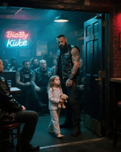 Barefoot, her Disney pajamas damp with tears, she froze under the neon lights. Thirty leather-clad bikers turned their scarred faces toward her, and the laughter died instantly.