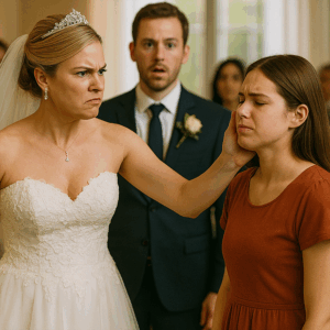 “The Arrogant Bride Slapped a Simple Girl in Front of Hundreds of Guests at Her Lavish Wedding — Laughing as Everyone Watched the Humiliation, Completely Unaware That the Quiet Girl She Just Insulted Was Her Groom’s Long-Lost Sister, Who Had Been Living Under a Different Name — But When the Truth Was Revealed Moments Later, the Groom’s Reaction and the Shocking Twist That Followed Left the Entire Wedding in Chaos and the Bride Begging for Forgiveness”