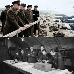 As evening settled in, the generals were invited to observe a full-scale rehearsal. On a stretch of coastline meant to mirror Normandy, hundreds of landing craft formed into waves and surged toward the beach. Explosions were simulated. Smoke drifted across the water. Pilots dove in low, practicing bombing runs before pulling away sharply.