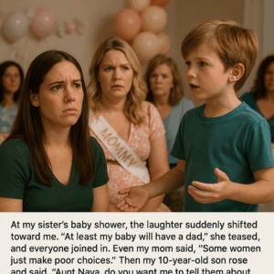 At her sister’s baby shower, Alisha endured cruel jokes and dismissive laughter. But when her ten-year-old son rose to defend her, the truth he revealed silenced the entire room.