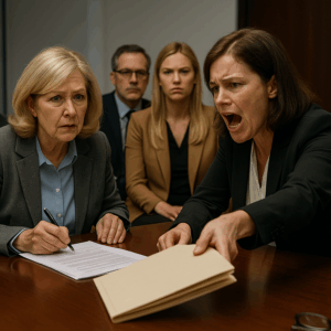 “A grandmother poised to sign away her empire, a daughter-in-law smiling with triumph, an assistant blackmailed into silence — until she slammed down a file and shouted: ‘Before you sign, you need to see the hospital records… for the other baby.’ What she revealed stunned everyone in the room.”