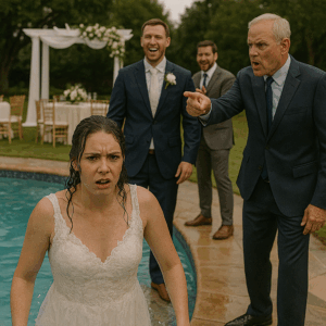 Among the guests stood her father, a man of quiet dignity who had watched the entire scene unfold. His daughter’s tears mixed with the pool water, her face pale with disbelief, her hands trembling as she clutched the wet fabric of her gown.