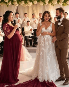 The moment she entered, silence rippled across the hall. She was glowing, her hand resting gently on her rounded belly. Gasps followed her as she walked with composure to the front, where my new bride and I stood.