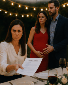Gasps rippled louder than before. Michael’s glass slipped from his fingers, wine splashing across the white linen. His mistress shifted uncomfortably, her crimson dress now a beacon of shame under the stares of the family.
