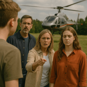 A helicopter—sleek, black, unmistakably official—descended toward the Carter property. The trees bent from the wind. The tablecloths whipped violently. People shielded their faces.