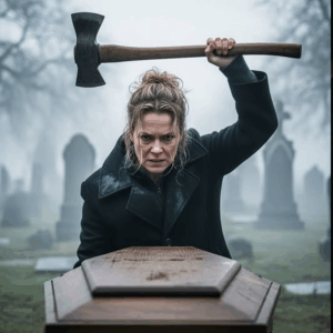 The sound echoed through the mist. The blade struck the coffin lid with a crack that silenced the whispers. Guests gasped, some screamed, others reached out to restrain her.