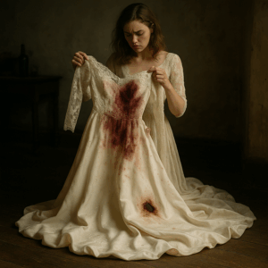I lifted the bodice. Burgundy stains bled through the lace like bruises.