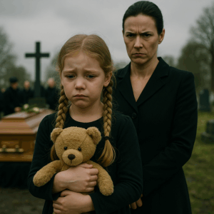 The morning of the funeral was gray, heavy with mist that clung to the stone church walls. Inside, rows of mourners whispered prayers as the organ groaned its solemn notes. Outside, a small girl stood clutching a teddy bear, her tiny fingers digging into the worn fabric as though it could anchor her to a world that had just collapsed.