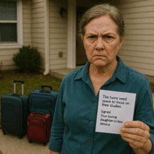 “The twins need space to focus on their studies. We’ve prepared the garage apartment for you. Signed, Your loving daughter-in-law, Jessica.”