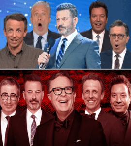 And now comes the twist: insiders suggest that in a move no one expected, Fallon, Kimmel, Seth Meyers and John Oliver are planning to share a single stage in protest. Four microphones. One mission.
