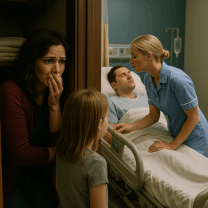 At my husband’s hospital bedside, I hid in a supply closet as another woman in uniform kissed him and claimed to be his wife. The betrayal shattered me—but when my daughter’s suspicions proved true and the police arrived, the truth behind his double life was darker than I imagined.