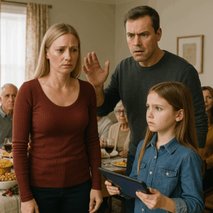 “The turkey was carved, the wine poured, and the family drama bubbling under the surface. Then Emma, just nine years old, stepped forward with her tablet. What she revealed in five simple words didn’t just ruin Thanksgiving — it shattered her father’s perfect mask forever. No one saw it coming.”