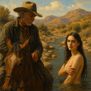 A young woman stood in the shallows, bathing as if she were alone in paradise. Sunlight gilded her hair, her skin luminous against the rippling water. She moved with innocence, unaware of eyes upon her.