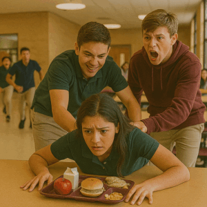 They laughed as they shoved the new girl onto the lunch table, spilling trays and food everywhere. Everyone froze when she didn’t cry or shout—she just stood up, silent, eyes cold as stone. Minutes later, when the principal walked in with two soldiers behind him, every bully ran.